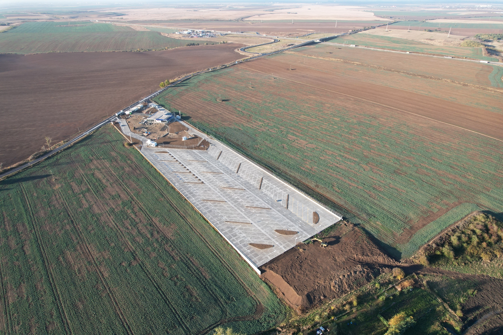 Etapa 1 – Finalizata si Receptionata 2023 – Parcarea Securizata nivel Platinum (CINEA) cu accese, intersectie la drum judetean, Cladire Servicii Soferi (lounge, toalete, bucatarie, dusuri, spalatorie).
